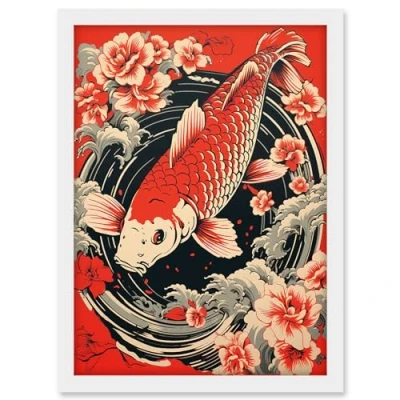 Artery8 Koi Fish Carp Japanese Whirlpool Red Black Floral Illustration Artwork Coy Framed A3 Wall Art Print
