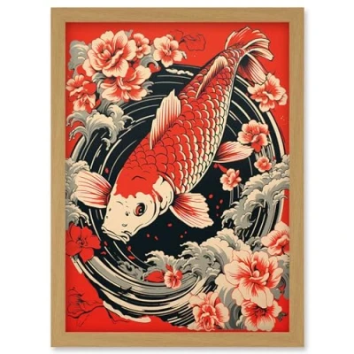 Artery8 Koi Fish Carp Japanese Whirlpool Red Black Floral Illustration Artwork Coy Framed Wall Art Print A4