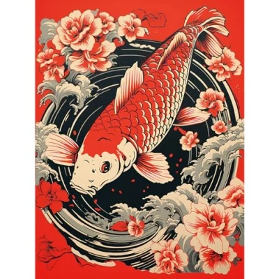 Artery8 Koi Fish Carp Japanese Whirlpool Red Black Floral Illustration Artwork Coy Large Wall Art Poster Print Thick Paper 18X24 Inch