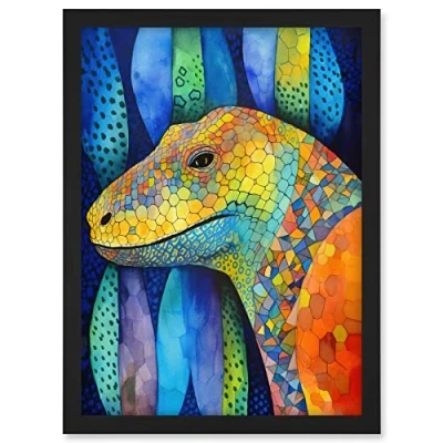Artery8 Komodo Dragon Vibrant Folk Art Watercolour Painting Artwork Framed A3 Wall Print
