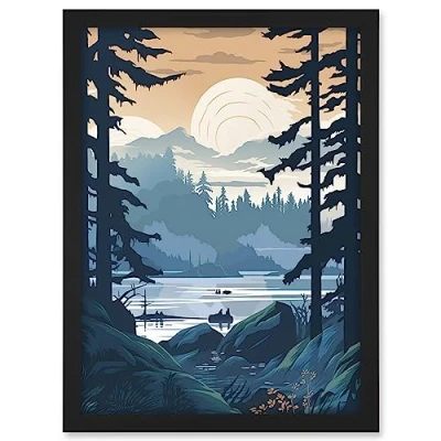 Artery8 Lake View in Rainforest Landscape Illustration Artwork Framed A3 Wall Art Print