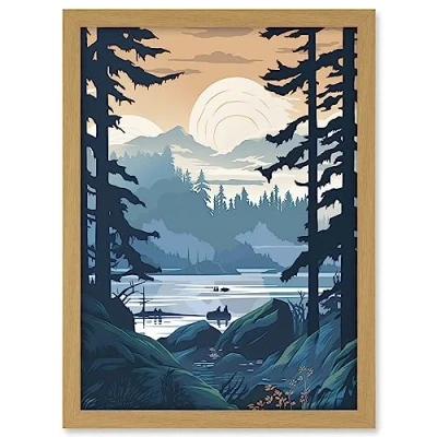 Artery8 Lake View in Rainforest Landscape Illustration Artwork Framed A3 Wall Art Print