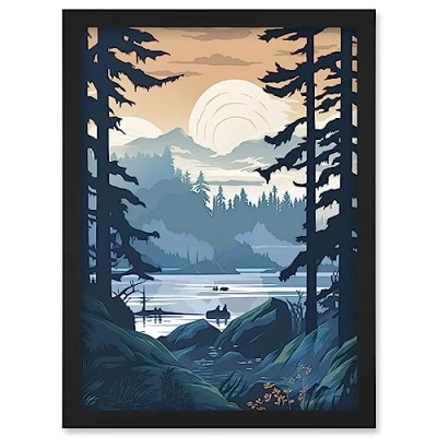Artery8 Lake View in Rainforest Landscape Illustration Artwork Framed Wall Art Print A4