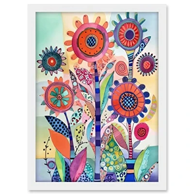 Artery8 Large Flower Blooms With Embroidery Style Patterns Folk Art Watercolour Painting Artwork Framed A3 Wall Print
