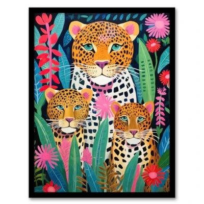 Artery8 Leopard Family Vibrant Oil Painting Orange Pink Green Floral Jungle Wildlife Kids Bedroom Artwork Framed Wall Art Print A4