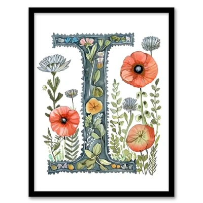 Artery8 Letter I in Watercolour Wildflowers Poppy Bouquet Floral Word Art For Her Birthday Mum Wife Woman Friend Artwork Framed Wall Print A4