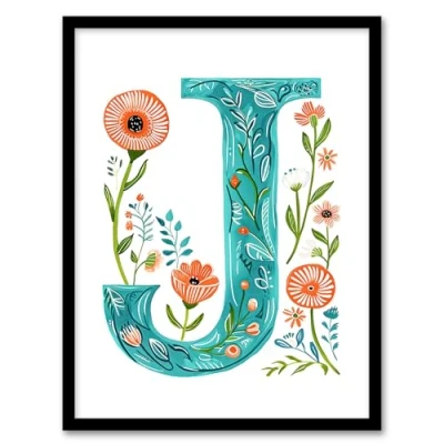 Artery8 Letter J in Watercolour Wildflowers Poppy Abstract Floral Word Art For Her Birthday Mum Wife Woman Friend Artwork Framed Wall Print A4