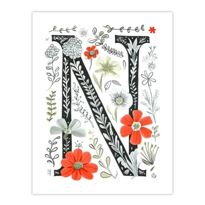 Artery8 Letter N in Poppies Wildflowers Pen Drawing Floral Word Art For Her Birthday Mum Wife Woman Friend Extra Large XL Wall Poster Print