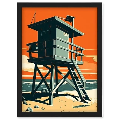 Artery8 Lifeguard Tower Seascape Pastel Colour Orange Teal Blue Beach Bathroom Artwork Framed Wall Art Print A4