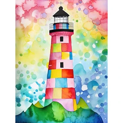 Artery8 Lighthouse At Sunrise Dreamy Folk Art Watercolour Painting Extra Large XL Wall Poster Print