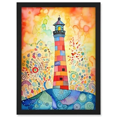Artery8 Lighthouse At Sunset Dreamy Folk Art Watercolour Painting Artwork Framed A3 Wall Print