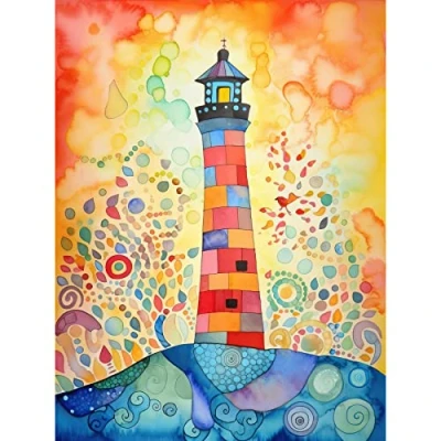 Artery8 Lighthouse At Sunset Dreamy Folk Art Watercolour Painting Extra Large XL Wall Poster Print