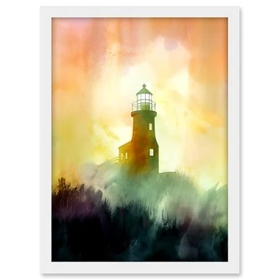 Artery8 Lighthouse in the Fog Watercolour Painting Soft Atmospheric Light Coastal Landscape Artwork Framed A3 Wall Art Print