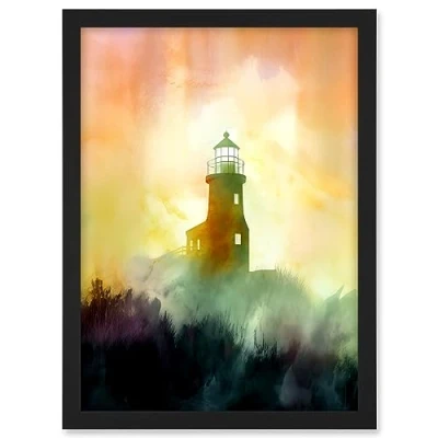 Artery8 Lighthouse in the Fog Watercolour Painting Soft Atmospheric Light Coastal Landscape Artwork Framed A3 Wall Art Print