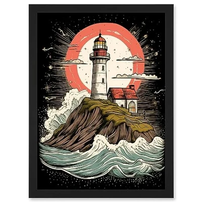 Artery8 Lighthouse on a Cliff Crushing Waves Below Rockabilly Americana 50s Artwork Framed A3 Wall Art Print