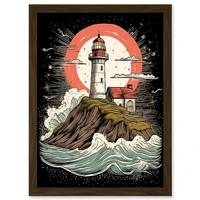 Artery8 Lighthouse on a Cliff Crushing Waves Below Rockabilly Americana 50s Artwork Framed Wall Art Print A4