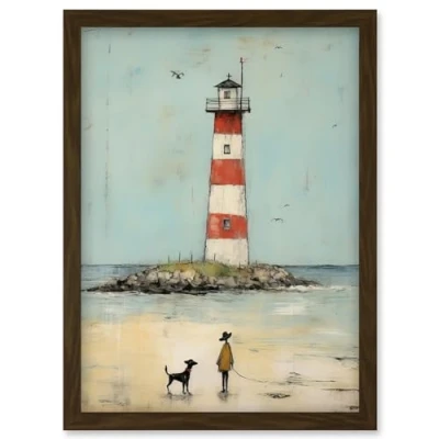 Artery8 Lighthouse Pastel Colour Painting Bathroom Artwork Red Blue Ochre Boy and Pet Dog Beach Walk Framed Wall Art Print A4