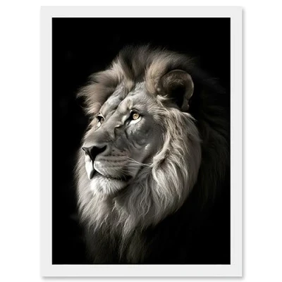 Artery8 Lion Head Portrait Dramatic Photograph Strong Leo Dark Atmospheric Light Artwork Framed Wall Art Print A4