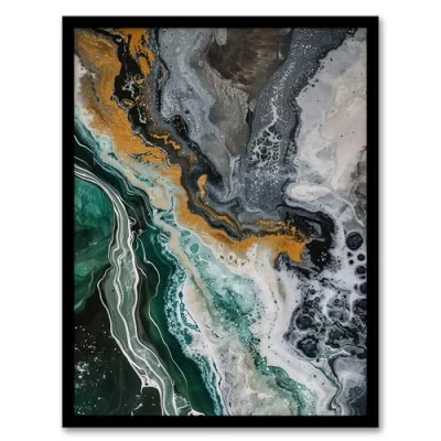 Artery8 Liquid Paint Emerald Gold Grey Abstract Painting Living Room Bathroom Artwork Framed Wall Art Print A4