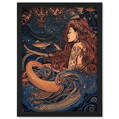 Artery8 Little Mermaid and Aquatic Animals Illustration Artwork Framed Wall Art Print A4