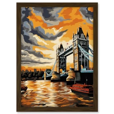 Artery8 London Tower Bridge Dramatic Sunset Sky Artwork Orange Grey River Thames Riverboat England Clouds Framed A3 Wall Art Print