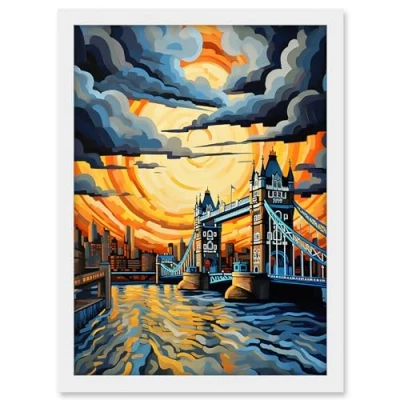 Artery8 London Tower Bridge Dramatic Sunset Vibrant Artwork Blue Orange River Thames England Cloudy Sky Framed A3 Wall Art Print