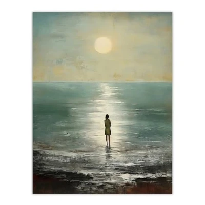 Artery8 Looking Out To Sea Oil Painting Alone At The Water Shore Moonlit Beach Seascape Large Wall Art Poster Print Thick Paper 18X24 Inch