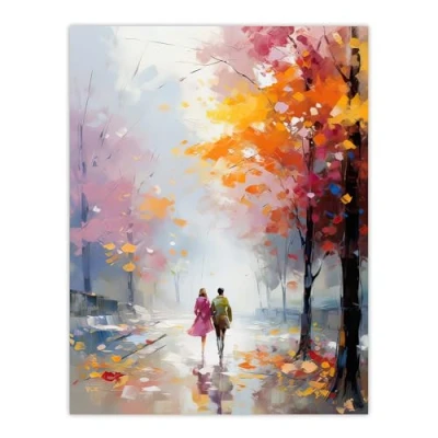 Artery8 Lovers Autumn Walk Oil Painting Orange Pink Blue Couple Walking Through Park Extra Large XL Wall Art Poster Print