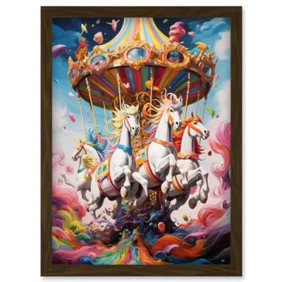 Artery8 Magical Carousel in Rainbow Clouds Bright Bold Vibrant Fantasy Kids Bedroom Baby Nursery Artwork Framed Wall Art Print A4