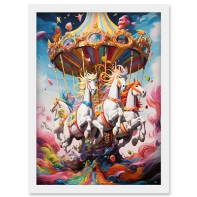 Artery8 Magical Carousel in Rainbow Clouds Bright Bold Vibrant Fantasy Kids Bedroom Baby Nursery Artwork Framed Wall Art Print A4