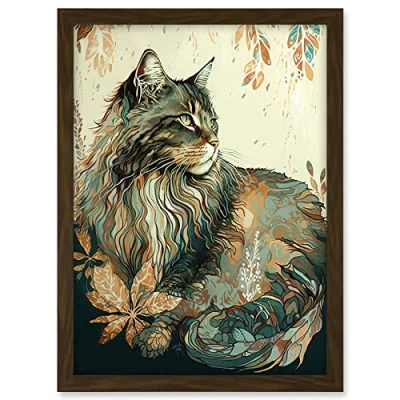 Artery8 Maine Coon Cat with Flower Pattern Modern Watercolour Illustration Artwork Framed A3 Wall Art Print