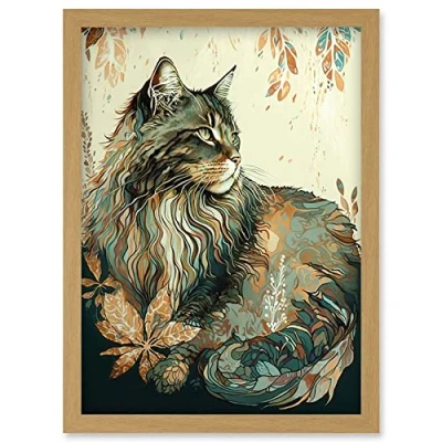 Artery8 Maine Coon Cat with Flower Pattern Modern Watercolour Illustration Artwork Framed Wall Art Print A4