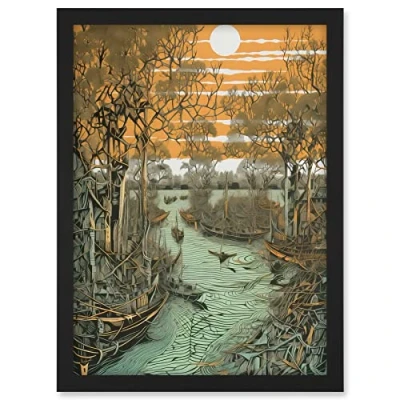 Artery8 Mangrove Forest Swamp Landscape Linocut Style Artwork Framed A3 Wall Art Print