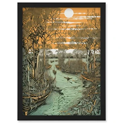 Artery8 Mangrove Forest Swamp Landscape Linocut Style Artwork Framed Wall Art Print A4