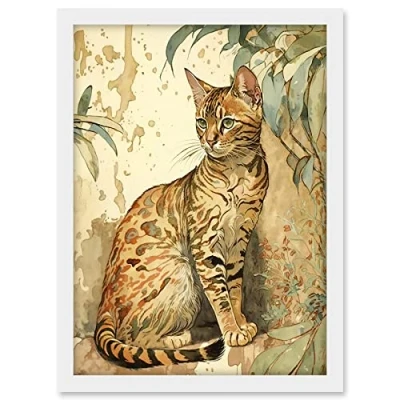 Artery8 Marble Coat Bengal Cat Perched on Street Wall Watercolour Illustration Artwork Framed A3 Art Print