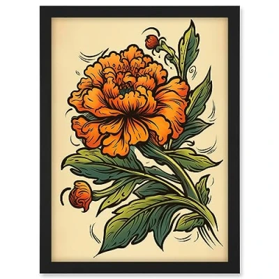 Artery8 Marigold Flower Old School USA Tattoo Ink Body Art Rockabilly Americana 50s Artwork Framed A3 Wall Print