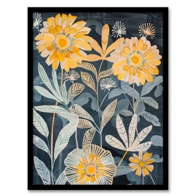Artery8 Marigold Flowers Artwork Dark Forest Floral Blue Living Room Framed Wall Art Print A4