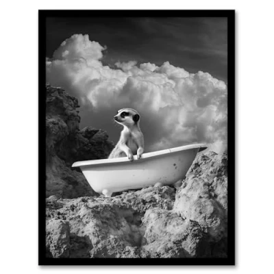 Artery8 Meerkat in Bathtub Surreal Bath Time Black White Bathroom Toilet Artwork Framed Wall Art Print A4