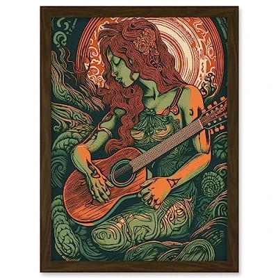 Artery8 Melancholic Woman with Guitar Linocut Illustration Artwork Framed A3 Wall Art Print