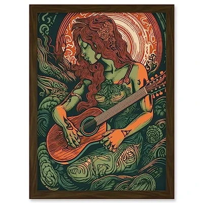 Artery8 Melancholic Woman with Guitar Linocut Illustration Artwork Framed Wall Art Print A4