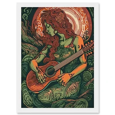 Artery8 Melancholic Woman with Guitar Linocut Illustration Artwork Framed Wall Art Print A4