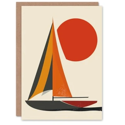 Artery8 Mid Century Modern Sail Boat Sunset Sun Painting Blank For Him Or Her Art Birthday Card
