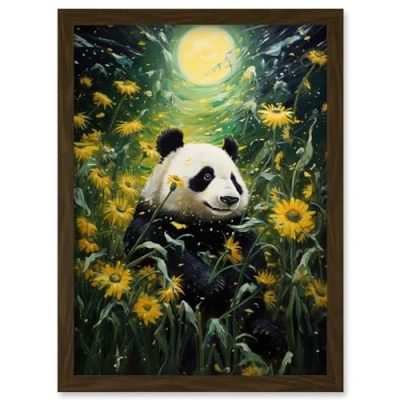 Artery8 Midsummer Night's Panda Dream Oil Painting Bear in a Full Moon Sunflower Field Landscape Kids Bedroom Artwork Framed Wall Art Print A4