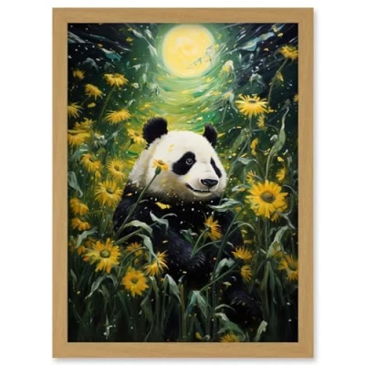 Artery8 Midsummer Night's Panda Dream Oil Painting Bear in a Full Moon Sunflower Field Landscape Kids Bedroom Artwork Framed Wall Art Print A4