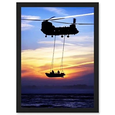 Artery8 Military UK British Chinook Helicopter Royal Marines Artwork Framed Wall Art Print A4