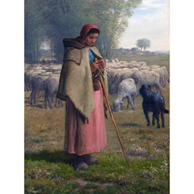 Artery8 Millet Young Girl Guarding Her Sheep Painting Premium Wall Art Canvas Print 18X24 Inch