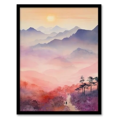 Artery8 Mist At Sunrise Over Purple Mountains Enchanting Watercolour Artwork Framed Wall Art Print A4