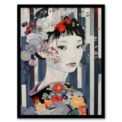 Artery8 Modern Japanese Woman Portrait in Delicate Floral Living Room Artwork Framed Wall Art Print A4