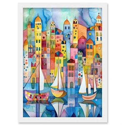 Artery8 Modern Marina Colourful Cityscape Pattern Folk Art Watercolour Painting Artwork Framed Wall Print A4