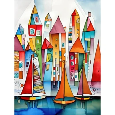 Artery8 Modern Marina Colourful Port Folk Art Watercolour Painting Large Wall Poster Print Thick Paper 18X24 Inch
